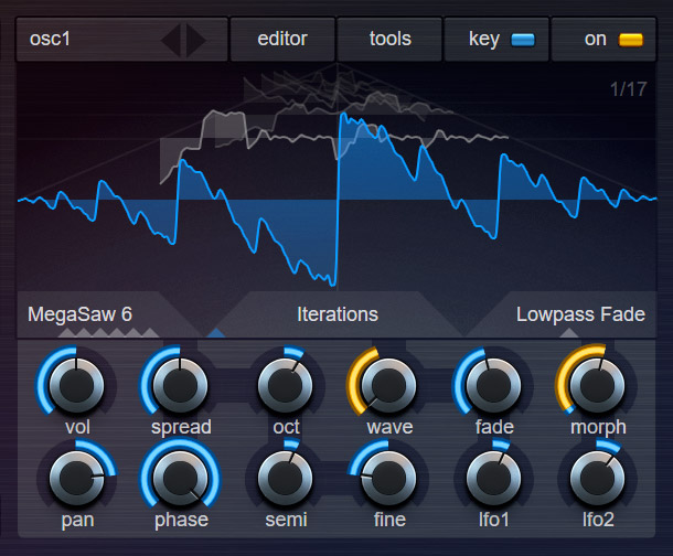Each oscillator-block itself again can contain up to 16 detuned hypersaw or additive oscillators. The hypersaw and additive modes can be combined with any kind of wavetable, waveform or synthesis-method.