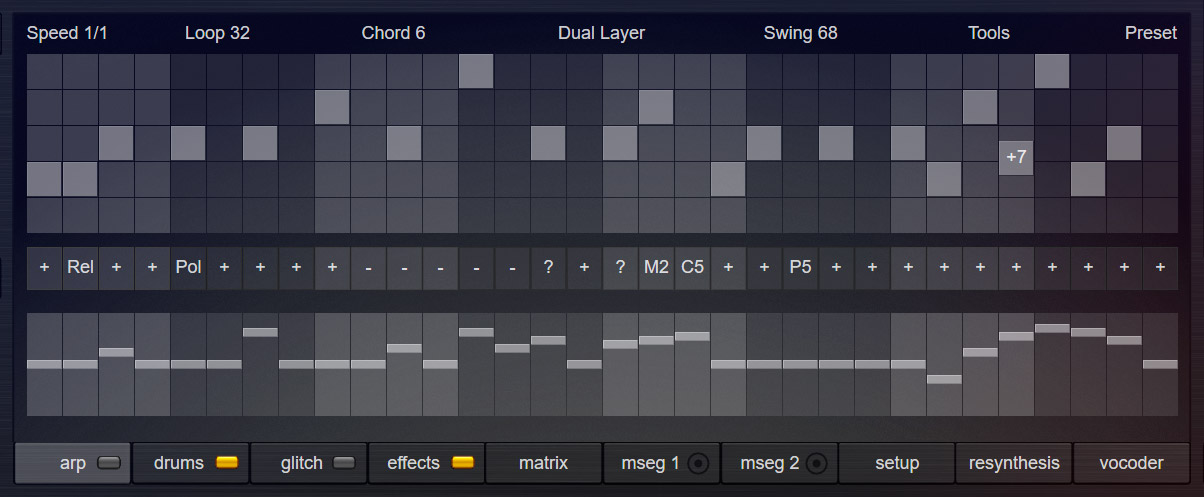 The arpeggiator supports advanced features such as glides, swing & shuffle, split, smart note-sorting, matrix-integration and gives you precise control over play-direction and velocity.