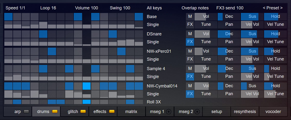 The drum-sequencer supports swing, shuffle, loop-length, effect-send, key-split, roll, mono-samples, stereo-samples, looped samples and looped waveforms. Your sounds can be passed through punchy, BPM-synced envelopes, which allow you to create impressive 'gated-drum-sounds' easily. You can stretch wav-files with drum-loops or any other rhythmic content so that they automatically sync to BPM.