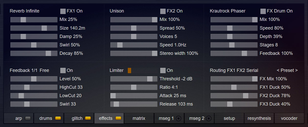 Icarus comes with a sophisticated and flexible effects section. 57 different effects, feedback and a limiter can be combined in multiple modular slots. This allows you to create new and exciting results, which can also be saved and loaded separately.