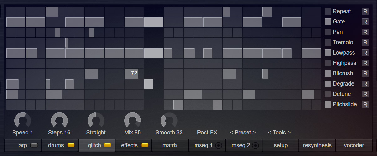 Icarus3 comes with a grid-based glitch-sequencer. You can chop your sounds and create modern glitchy, pitchstop, trancegate or stuttering effects.