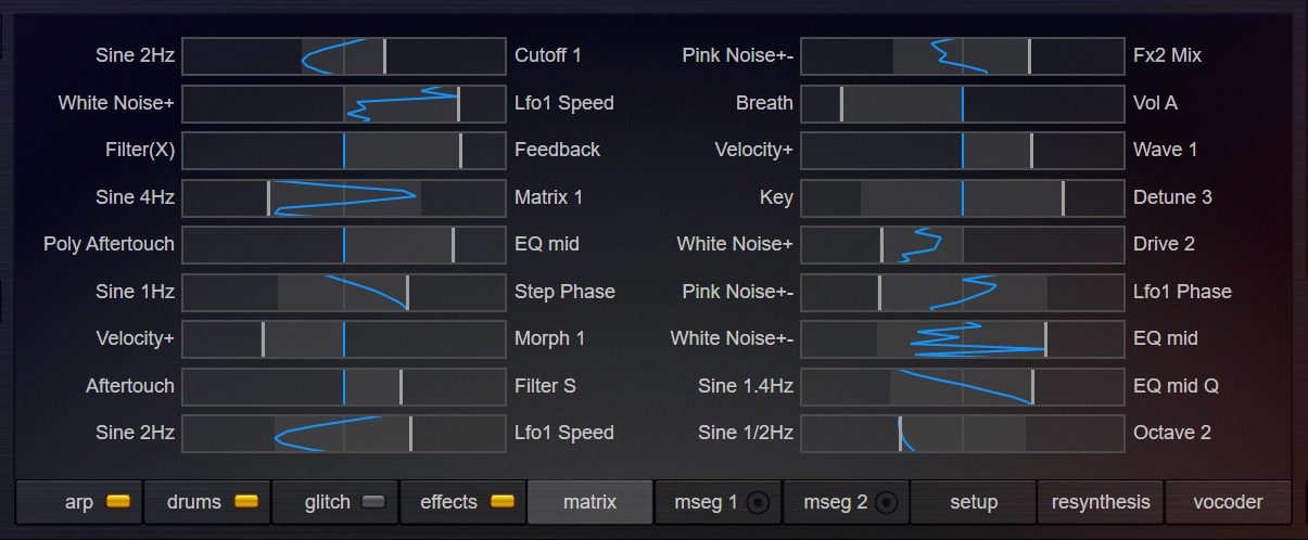 Über die Matrix lassen sich verschiedene Modulationsquellen präzise mit beliebigen Klangparametern verknüpfen: LFOs, Multistage-Envelopes, druckvolle Hüllkurven, Step-Sequenzer, MIDI-Signale, ...