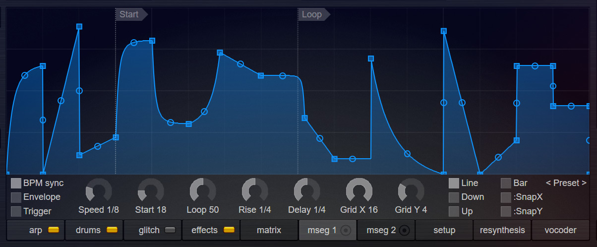 Literally anything is possible: The MSEGs can be synced to BPM, sync with the arpeggiator or run freely. Triads or dotted rhythms are also supported. You can define loop-points and start points. You can delay or fade the MSEGs. You can move, add or delete points with your mouse. You can bend lines upwards or downwards to change their shape or even create precise rectangular curves. The MSEGs can be edited completely freely or you can snap points to a grid of a select-able size. It is also possible to draw triangles, bars or ramps.
