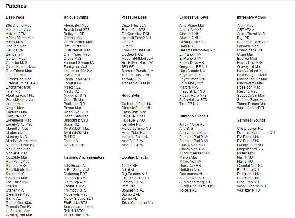 - FM keys, semireal sounds, futuristic pads, cut-through synths, organic atmospheres, dirtiest basses, warped arpeggios